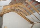 - Теперь переходим к укладке утеплителя. Минеральную вату необходимо закладывать между стропилами так, чтобы она плотно прилегала к ним и не провисала. Если шаг стропил больше ширины плитного утеплителя, выполняют дополнительный каркас из бруса. Если высота стропил не позволяет заложить между ними теплоизоляционный материал требуемой толщины (например, если стропила высотой 150 мм, а изолятор – 200 мм), то к стропильным ногам снизу прибивают брус на требуемую высоту.